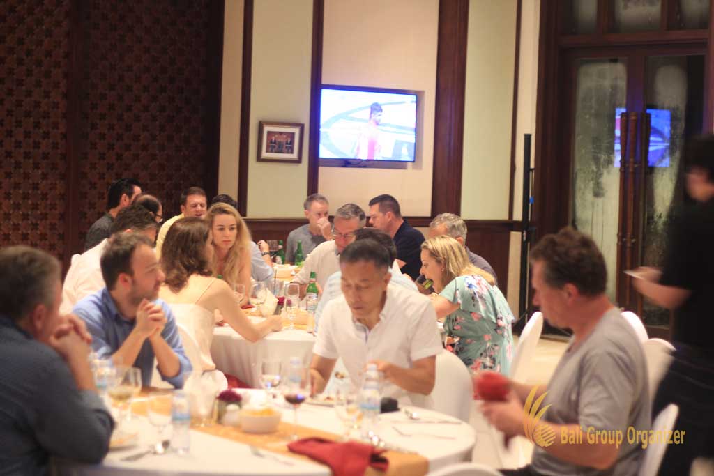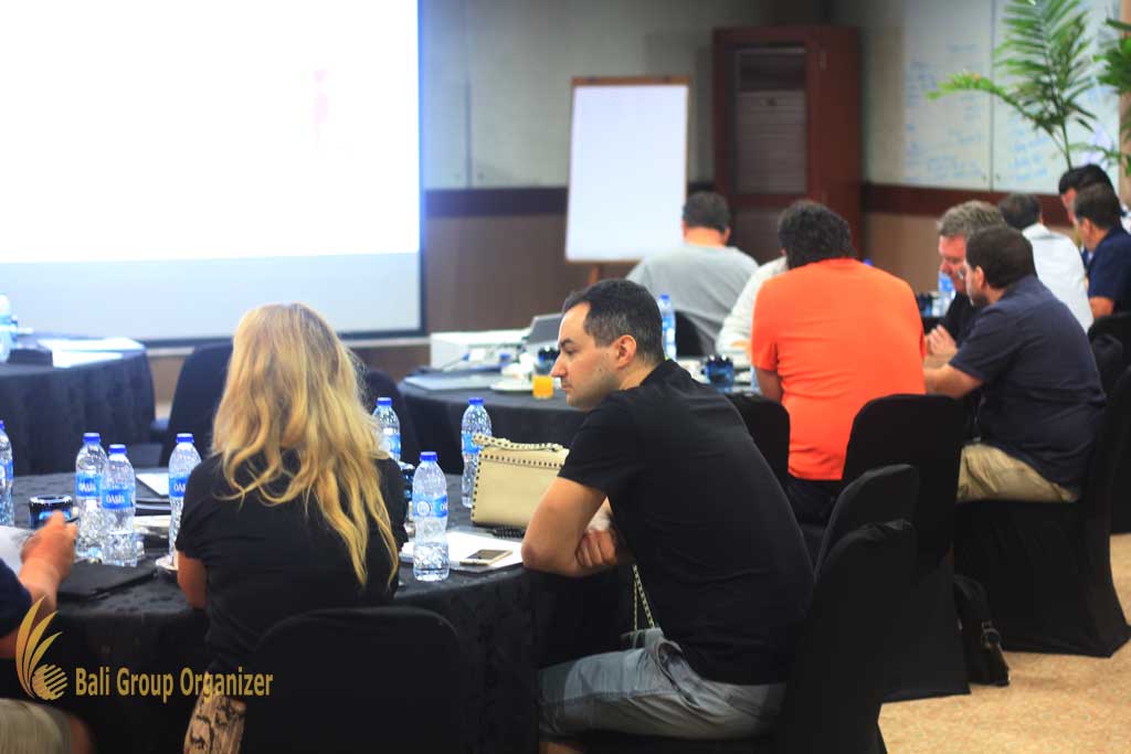 We start this corporate meeting at 08.00 am at hotel meeting room until 17.00 pm. The meeting room has been set up the round table with a screen and projector in front. As usual, 2 times of coffee break are served in the middle of the meeting session and followed by lunch at the hotel’s restaurant. Meanwhile, they have joined dinner at Bali National Golf with free flow drinks.